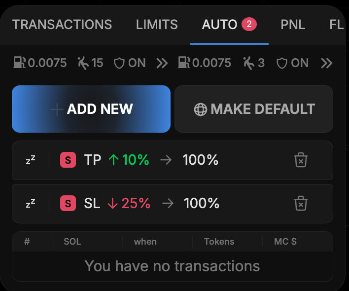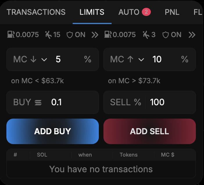 Set up automatic sell orders: TP (Take Profit) triggers when the price rises, and SL (Stop Loss) triggers when your position value drops by the specified percentage